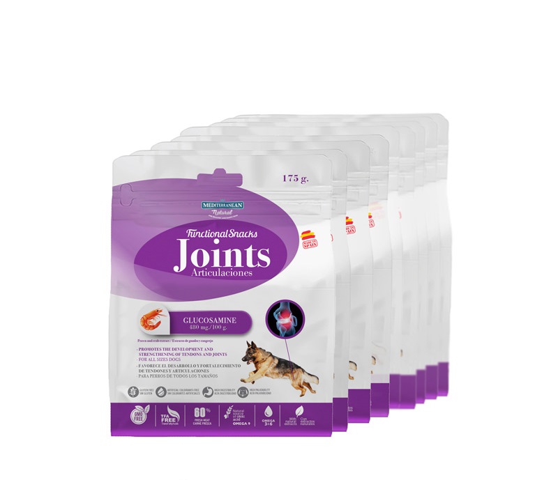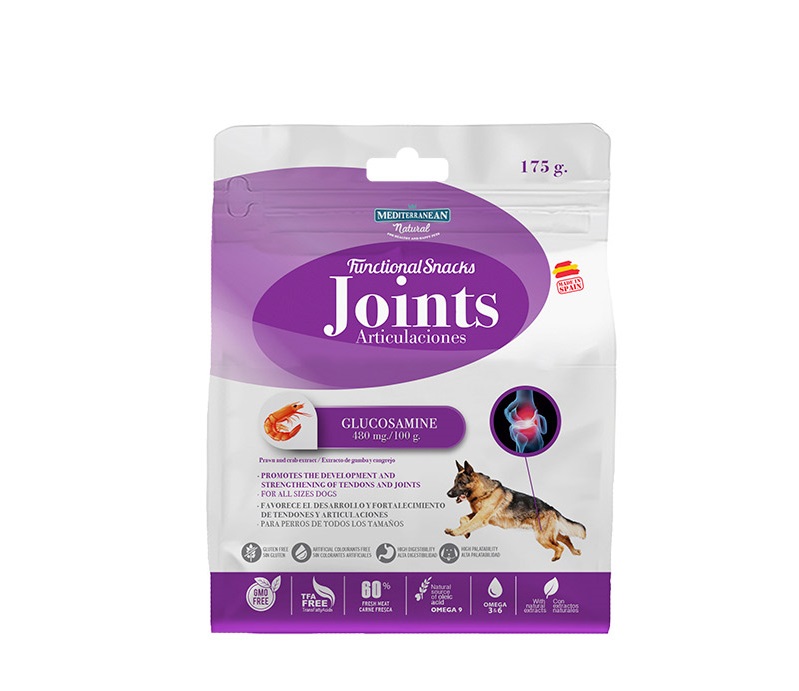 Mediterranean Natural Functional Snacks JOINTS to przysmak treningowy wytwarzany w 100% z produktów naturalnych oraz dużą zawartością glukozaminy, która poprawia kondycję stawów Twojego pupila. Niewielki rozmiar przysmaków ułatwia dozowanie produktu. Jest to smakowita uczta dla dorosłych psów, szczególnie dużych ras, podatnych na degeneracyjny proces zmian stawów, takich jak dysplazja stawu biodrowego.
