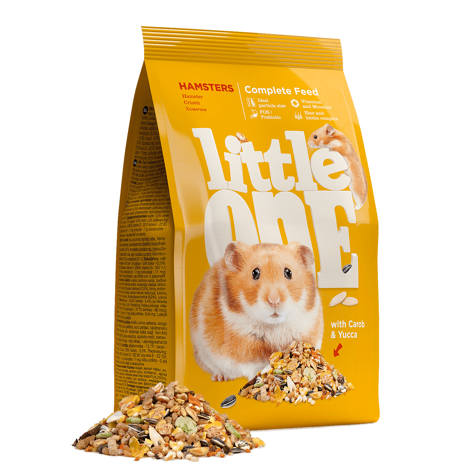 Karma dla chomików Little One zawiera różnorodne składniki, w tym zboża, nasiona, orzechy i rzadkie owoce. Dieta dostosowana jest do wymagań żywieniowych chomika standardowego i karłowatego. Skład: pszenica, proso czerwone, sorgo białe, jęczmień, granulki wieloziarniste, owies łuskany, pestki słonecznika, płatki jęczmienne, płatki kukurydziane, gryka, chleb świętojański, płatki grochowe, pszenica dmuchana, kukurydza dmuchana, jęczmień dmuchany, orzeszki ziemne, kukurydza, słodkie płatki łubinu, suszona marchew, pestki dyni, fruktooligosacharydy, ekstrakt z juki.