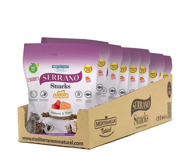 MEDITERRANEAN NATURAL Serrano Przekąski prosto z Hiszpanii to delikatnie, mięsne kawałki, które dzięki niewielkiemu rozmiarowi są idealne dla Twojego kota. Wykonane ze świeżego mięsa i ryb gotowanych w niskiej temperaturze, zapewniają wszystkie składniki odżywcze. Ponadto, przysmaki SERRANO SNACKS dla kotów zawierają składniki, które pomagają zapobiegać tworzeniu się kłaczków, sprzyjając w ten sposób prawidłowej czynności przewodu pokarmowego.