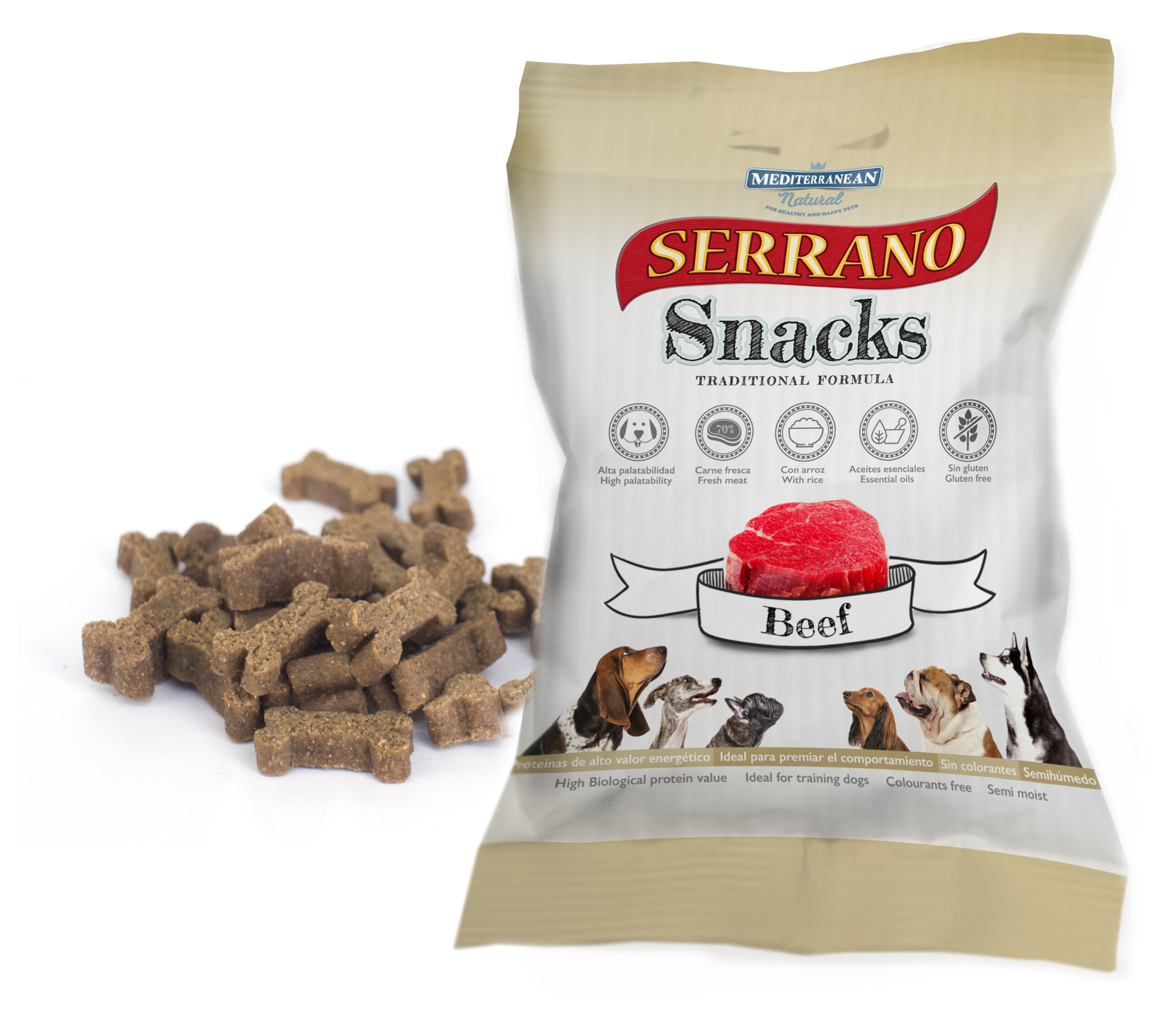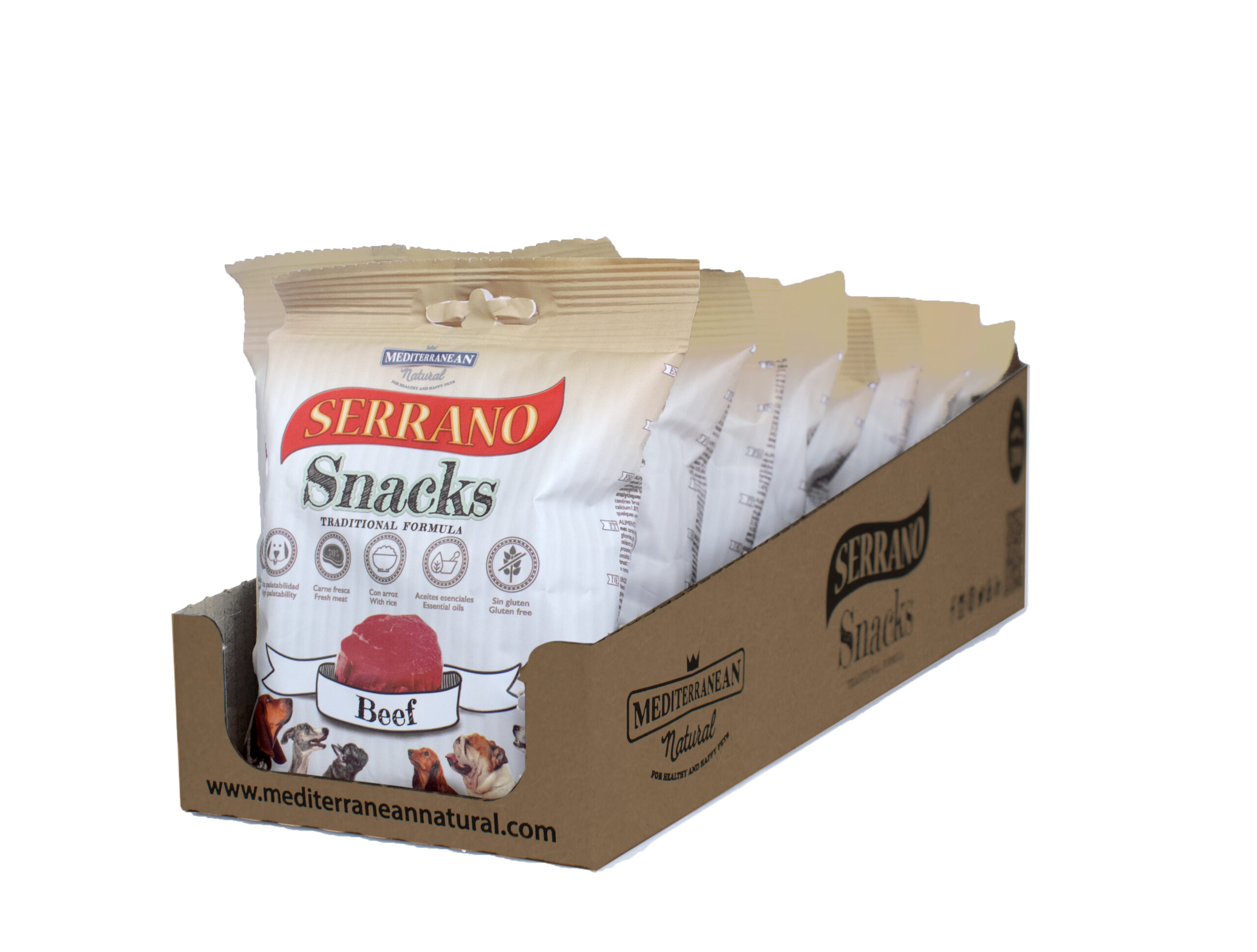 MEDITERRANEAN NATURAL Serrano Przekąski prosto z Hiszpanii to delikatnie, mięsne kawałki w kształcie kostki. Przysmak zawiera wszystkie niezbędne składniki odżywcze, a jego niewielki rozmiar gwarantuje bezpieczeństwo Twojego pupila. Produkty SERRANO Snacks to wspaniałe urozmaicenie codziennej diety Twojego ulubieńca. Te smakowite i soczyste przekąski zawierają aż 70% świeżego mięsa (60% w „Serrano Przekąski dla szczeniąt”).